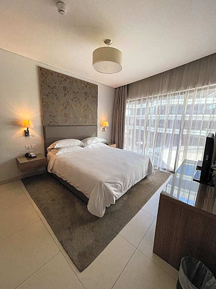 Pool View Duplex One Bedroom Apartment With Balcony is 807 square feet and includes a double bed 131-150 width plus extra beds on demand, desk, satellite tv , cable tv, hairdryer, tea and coffee making facilities , ironing set, safe, bathrobes, and slippers.